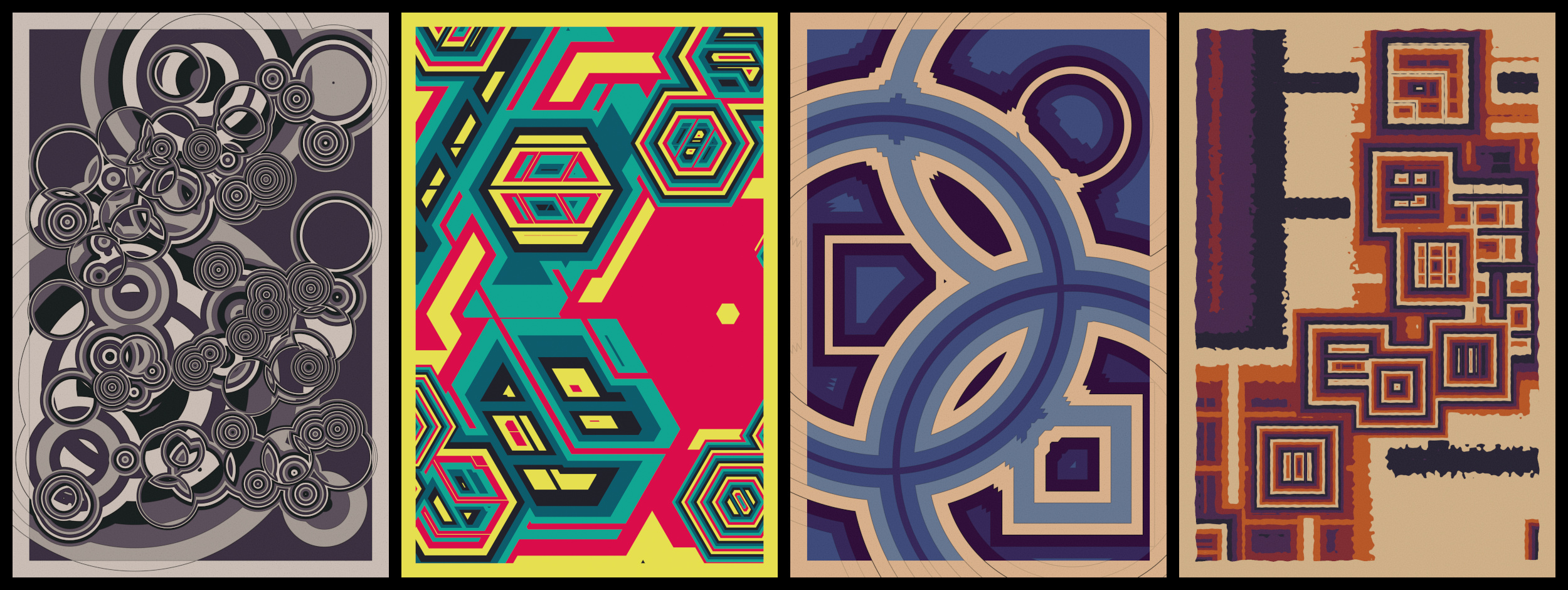 Two or three large shapes are generated and placed precisely. The shape generation is repeated at different scales, and the results are combined in various ways.
